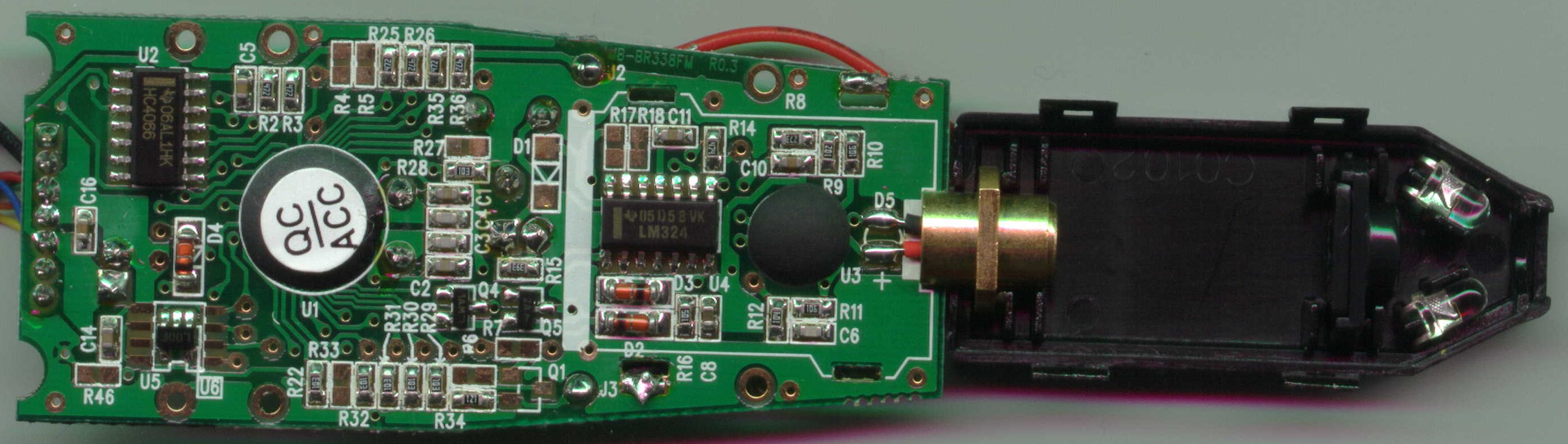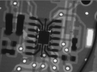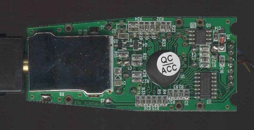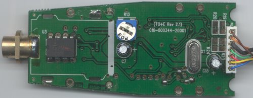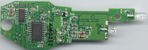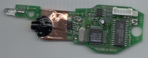 A sharp-eyed irrelevant@dm-mm.com commented "Looking at the board pads near the EEPROM it appears they are used during the final test to program in the serial number. In cuecat2b.jpg the pads to the right show small indentations as though probes had been used to power-up the board and program it during final test."