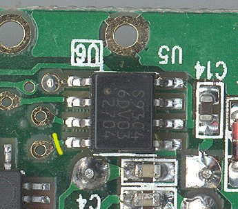 Or, you can slice this line by the microcontroller to sever the DO (data out) line (I'd be inclined to try this one myself - the floating voltages could be fun here). Remember - you should only need to cut only one line to disable the serial ID - take your pick.